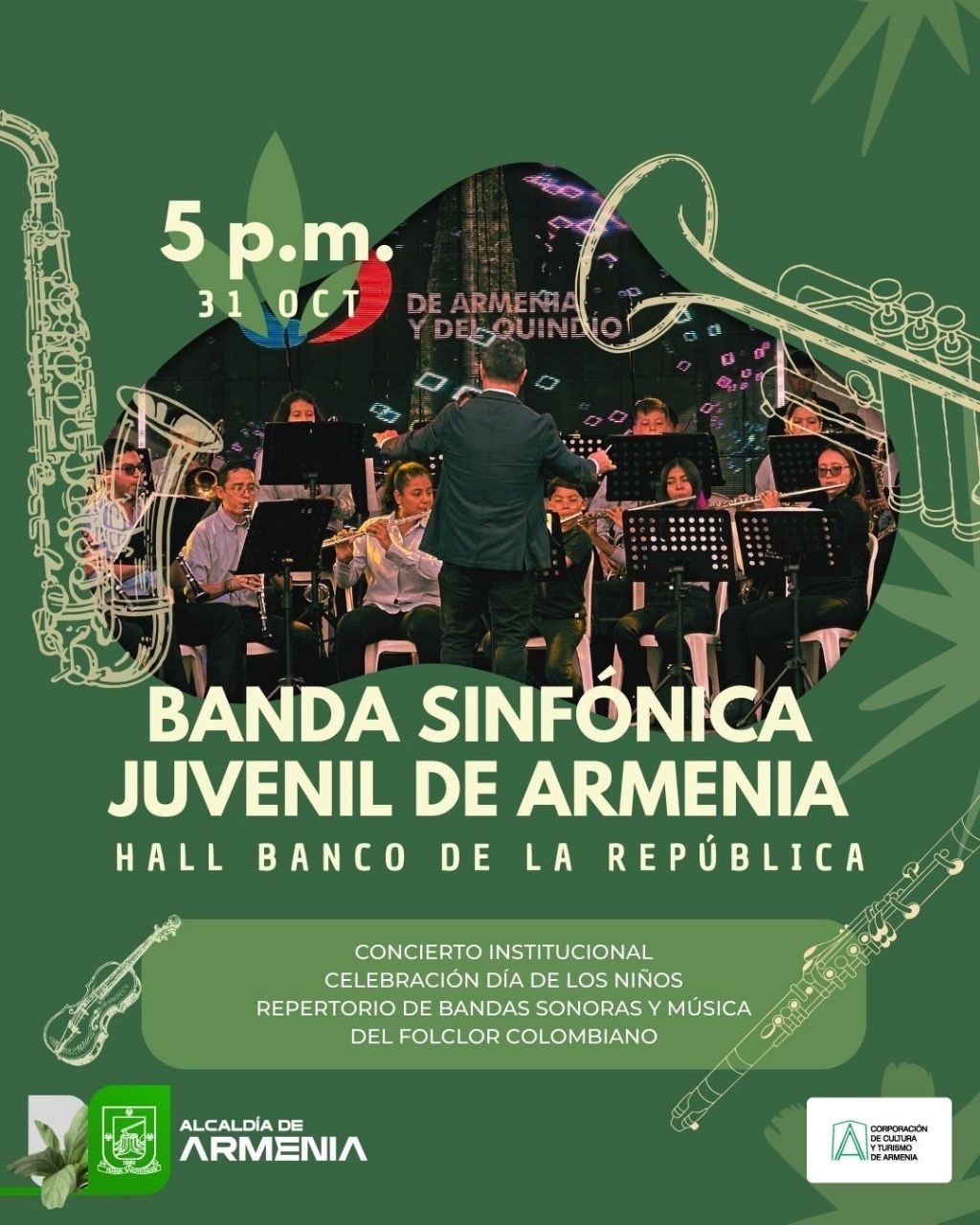 Con motivo de la celebración del día de los niños, el próximo jueves 31 de octubre de 2024, la Banda Sinfónica Juvenil de Armenia realizará un concierto a las 5:00 p.m. en el hall del Banco de la República. Este evento ofrecerá un repertorio variado que incluye bandas sonoras de películas y canciones del folclor colombiano, prometiendo una experiencia musical divertida, no solo para los niños, sino para todos los asistentes