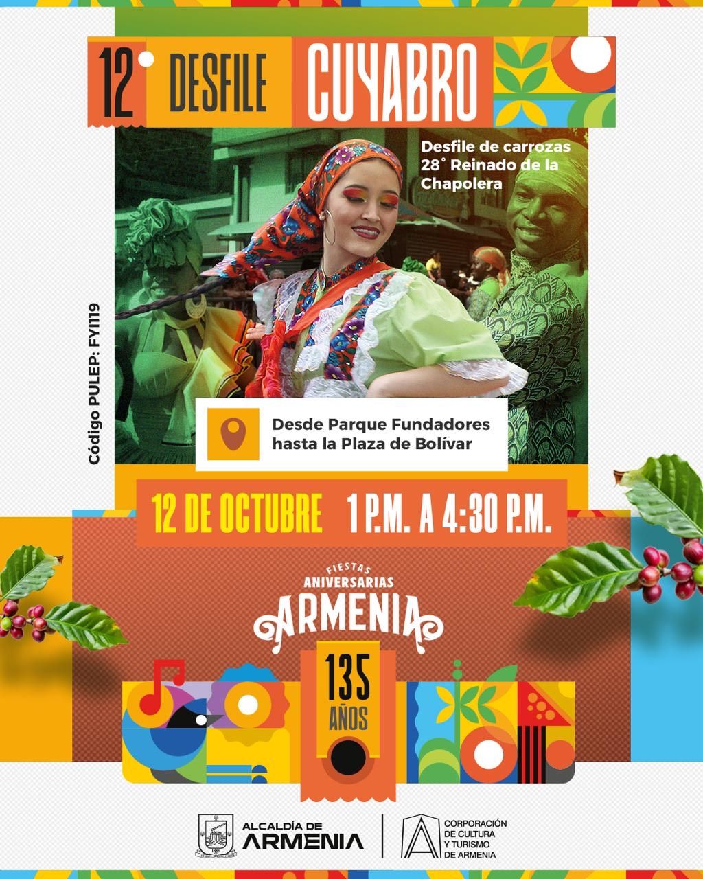 Este sábado 12 de octubre, la Alcaldía de Armenia inundará las calles de artistas, colores y tradición con el Desfile Cuyabro en su versión número 12 y el Desfile de Carrozas del 28º Reinado de la Chapolera, un evento emblemático que conmemora los 135 años de la capital quindiana. El desfile tiene como objetivo principal compartir con los ciudadanos las manifestaciones culturales, artísticas y costumbristas de nuestra región. El recorrido se llevará a cabo desde el parque Los Fundadores hasta la Plaza de Bolívar y contará con la participación de 950 artistas y 23 comparsas, de las...