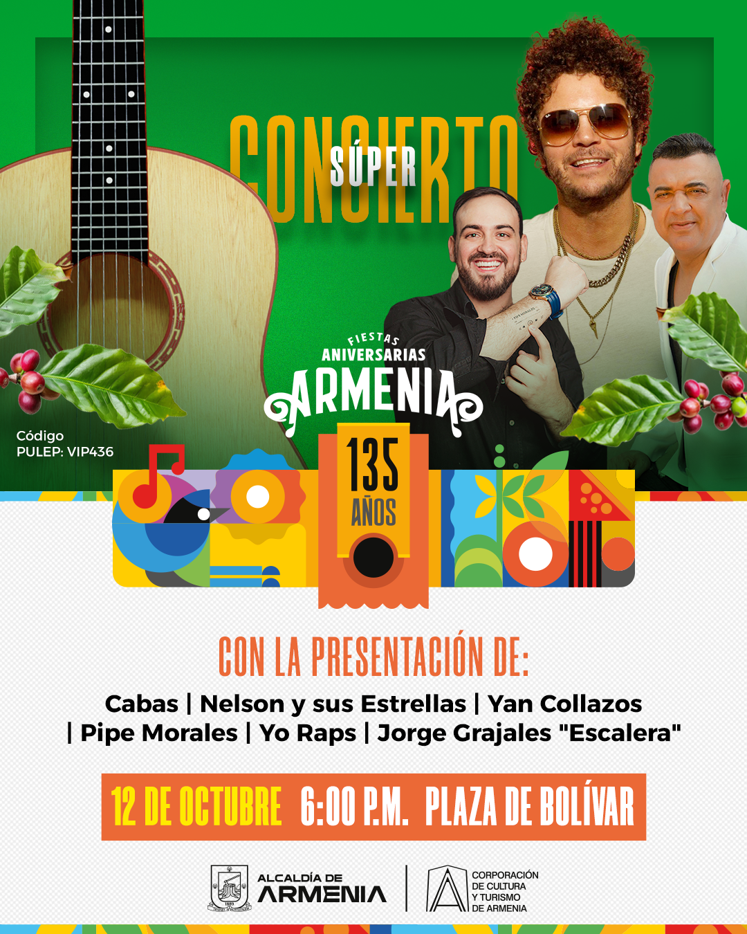 La reconocida Plaza Bolívar se transformará en el corazón de la música el próximo 12 de octubre a las 6:00 p.m. con el súper concierto, un evento que promete ofrecer una noche espectacular llena de ritmo y energía. Entre los artistas destacados que se presentarán contaremos con la actuación de Cabas, reconocido por su estilo único y su capacidad de conectar con el público. También se unirán Nelson y sus Estrellas, quienes aportarán su característico sabor musical. El concierto continuará con la energía contagiosa de Yan Collazos y el carisma de Pipe Morales, mientras que Yo Raps traerá...