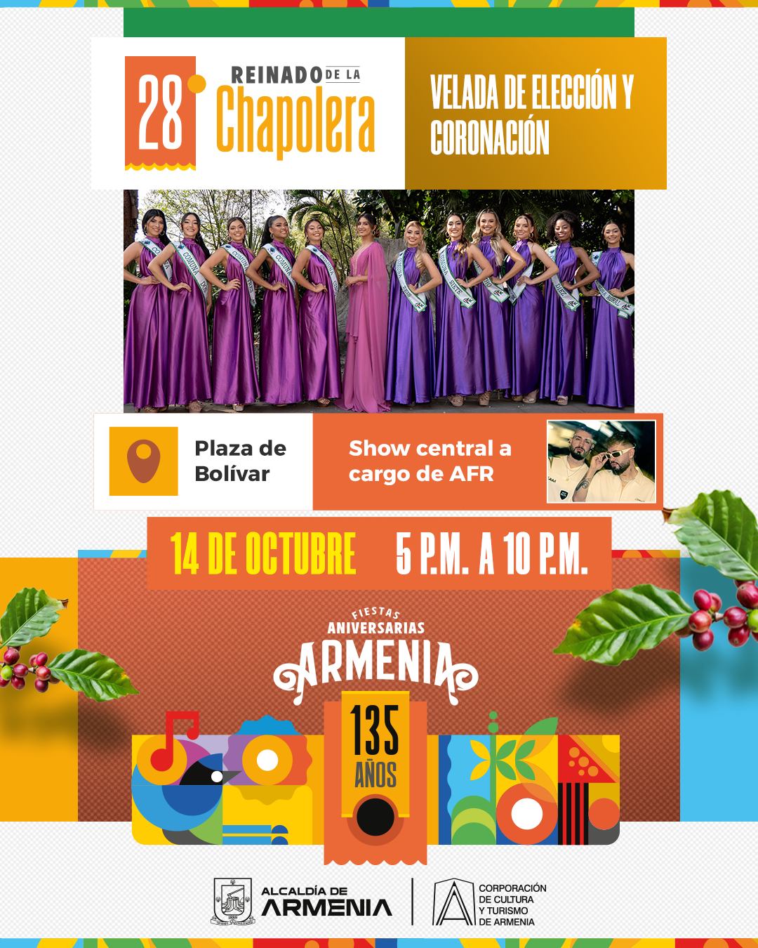 Invitamos  a todos los ciudadanos y visitantes  a la velada de elección y coronación de nuestras 11 candidatas, que se celebrará el próximo 14 de octubre a las 5:00 p.m. en la  Plaza Bolívar. Este evento contará con un show central a cargo del popular grupo de música urbana AFR, prometiendo una tarde llena de energía y entretenimiento. Nuestras candidatas: Comuna 1: Sofía Gálvez Peña Comuna 2: Deisy Katherine Hencker Viancha Comuna 3: Yvette Daniela Campo Osorio Comuna 4: Michel Dayana Gómez Ararat Comuna 5: Michelle Daniela Ferraro Muñoz Comuna...