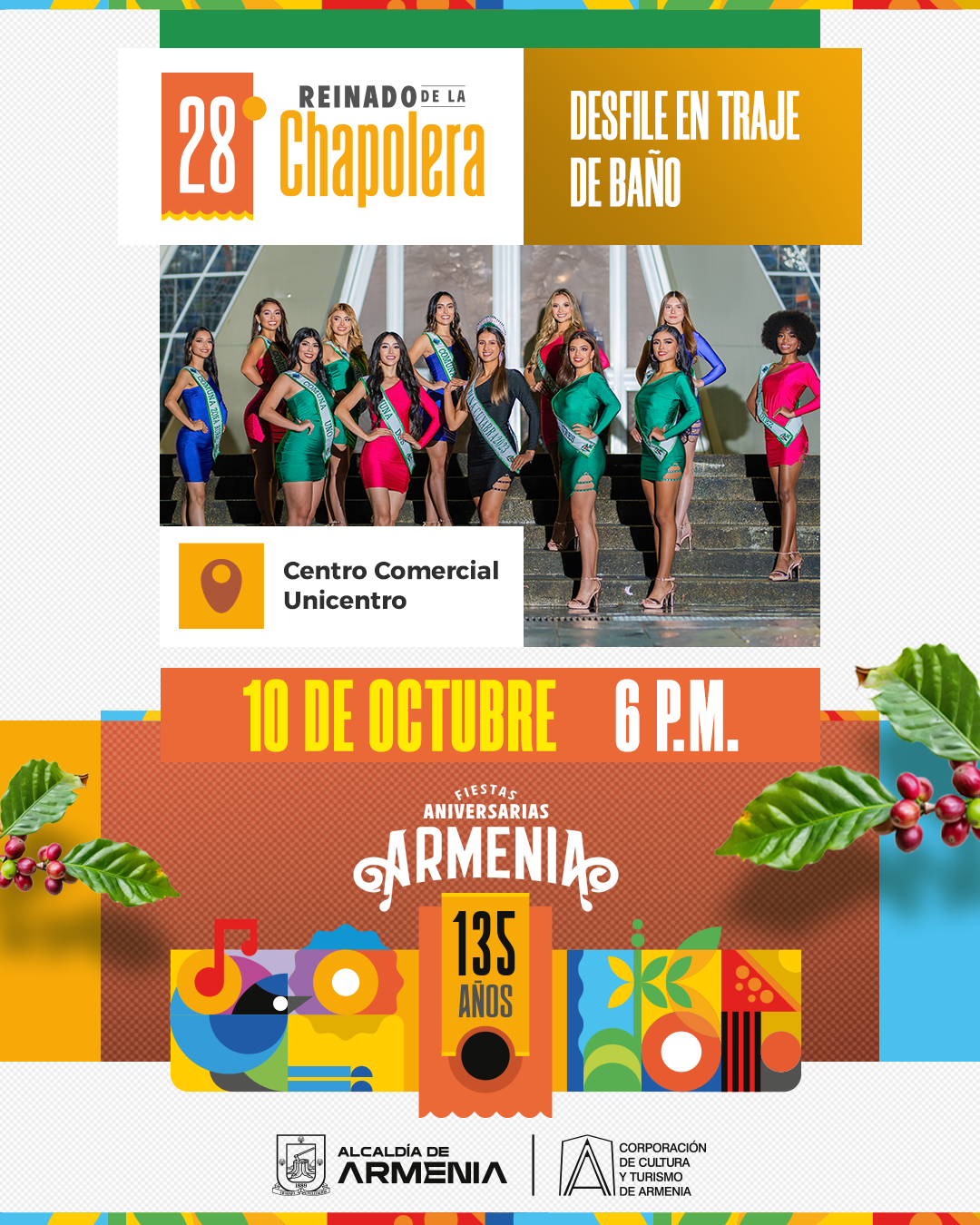 Este jueves 10 de octubre, el Centro Comercial Unicentro se convertirá en el escenario principal de las candidatas del 28° Reinado de la Chapolera, donde la belleza y el talento se darán cita en un espectacular desfile en traje de baño, a partir de las 6:00 p.m. Invitamos a la comunidad a unirse a nosotros para disfrutar de una tarde festiva, donde el estilo y la cultura se fusionan en un ambiente alegre y lleno de energía. Este gran desfile será el espacio perfecto para destacar la belleza y el carisma de nuestras candidatas. ¡No te pierdas la oportunidad de ser parte de esta celebración!...