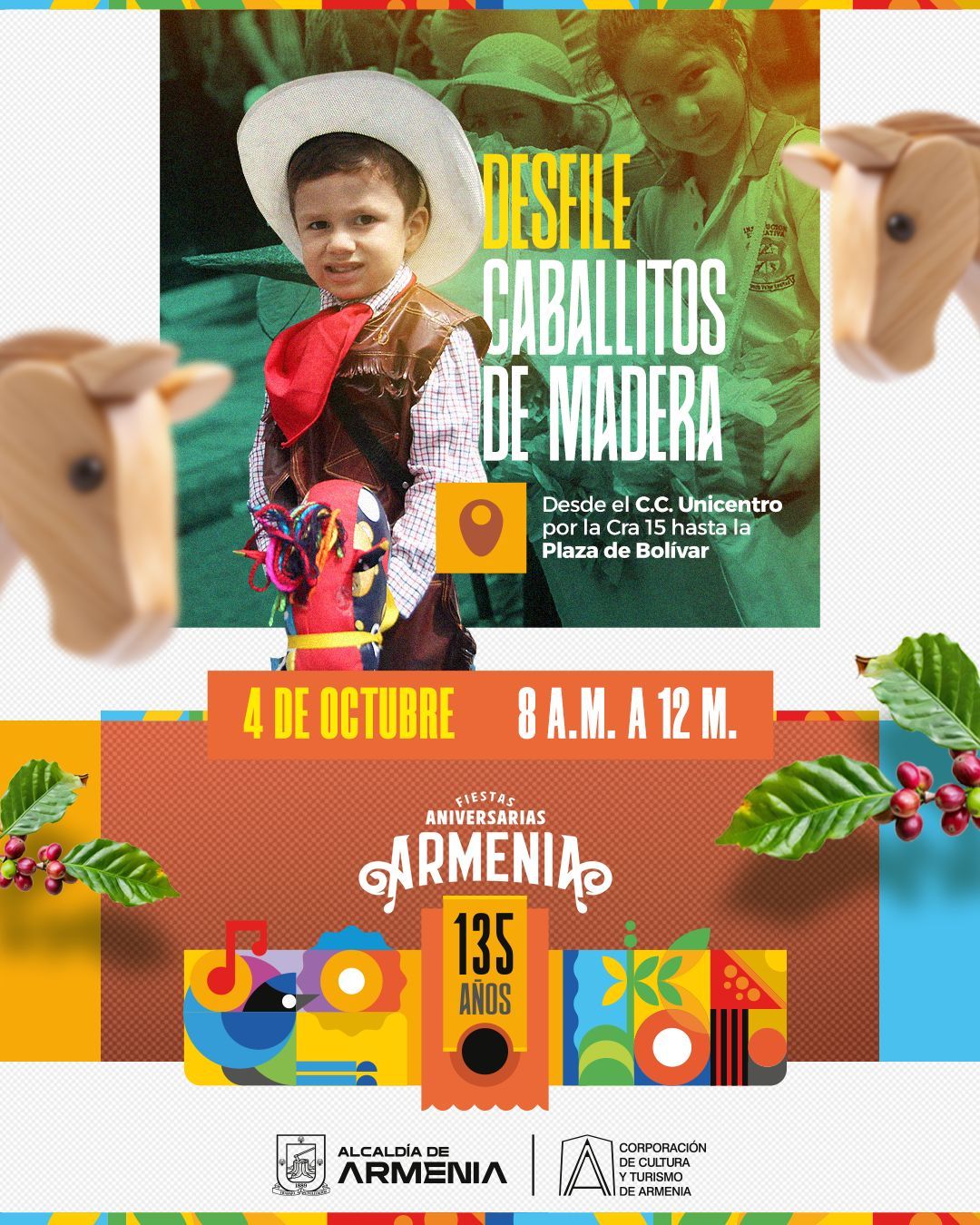 Este viernes, a partir de las 8:00 a. m., el Desfile Caballitos de Madera, organizado por el Imdera, marcará el inicio de las Fiestas Aniversarias Armenia 135 años. Este evento reunirá a miles de niños, niñas, docentes y padres de familia en un colorido desfile que recorrerá las principales calles del centro de la ciudad.  El punto de partida será el Centro Comercial Unicentro, y el recorrido finalizará en la Plaza de Bolívar, donde se llevará a cabo la premiación. El desfile contará con la presencia del alcalde de Armenia, James Padilla García, quien acompañará a los cerca de 3.000...