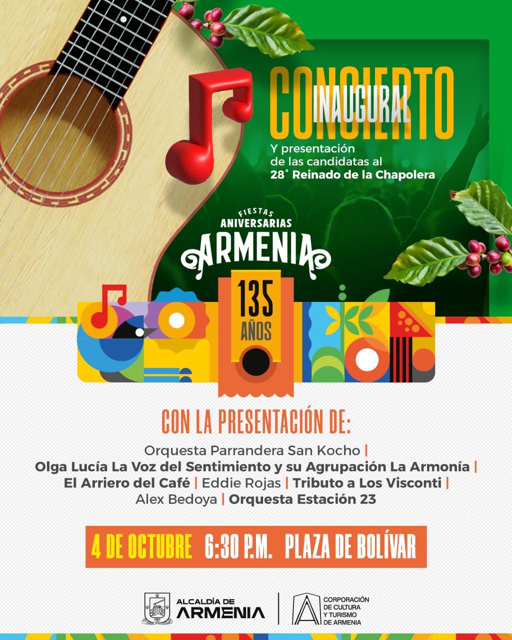 Esta noche, a partir de las 6:00 p.m., en la Plaza de Bolívar, se llevará a cabo el concierto inaugural de las Fiestas Aniversarias de Armenia, celebrando los 135 años de nuestra ciudad. Este evento promete ser una velada llena de cultura y alegría para todos los armenios. El concierto contará con la participación de destacados artistas locales, quienes ofrecerán un espectáculo inolvidable. Entre los talentos que se presentarán se encuentran: Orquesta Parrandera San Kocho, Olga Lucía La Voz del Sentimiento y su Agrupación La Armonía, El Arriero del Café, Eddie Rojas, Tributo a Los...