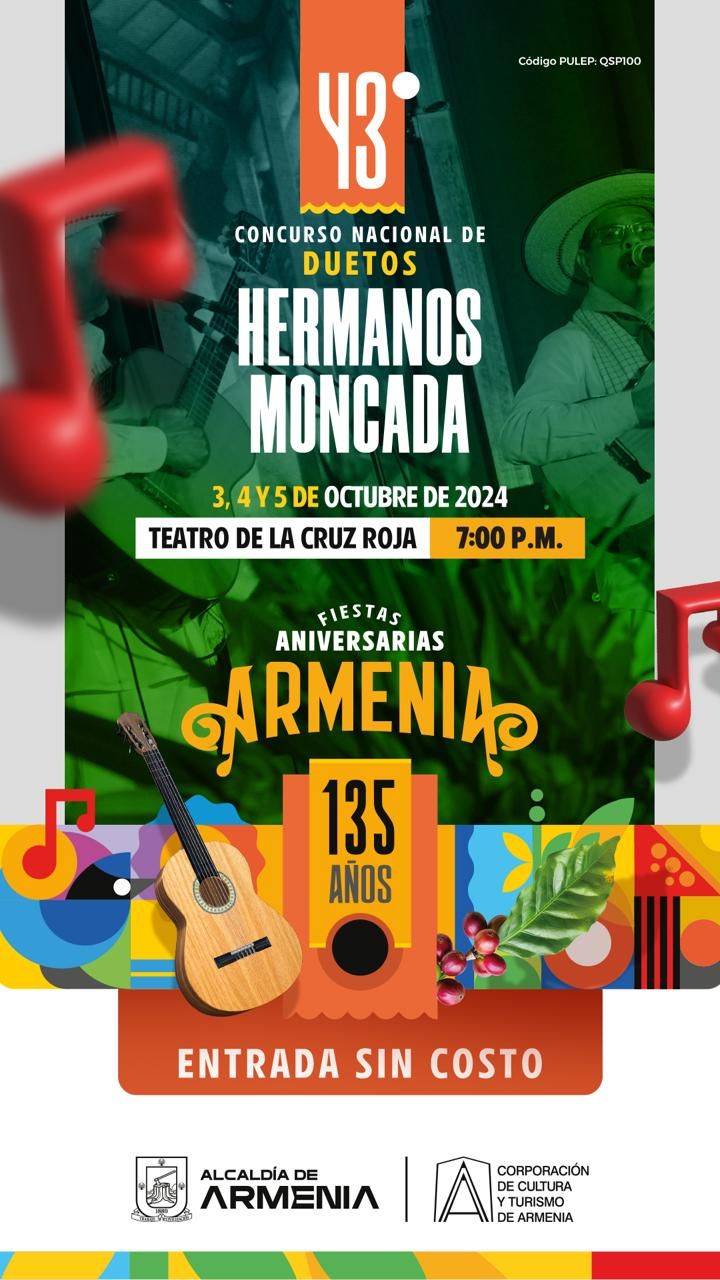 Hoy inician las Fiestas Aniversarias Armenia 135 años con el 43° Concurso Nacional de Duetos Hermanos Moncada, un importante evento de música andina colombiana, que se llevará a cabo los días 3, 4 y 5 de octubre de 2024 en el Teatro de la Cruz Roja, desde las 7:00 p.m. Este maravilloso evento no tiene ningún costo, además, contará con la participación especial de Valentina Loaiza Serna, quien estará acompañada por el maestro Rodrigo Prado. Invitamos a todos los ciudadanos a que asistan a este increíble concurso que tendrá seis participantes de duetos tradicionales, cuatro de duetos...