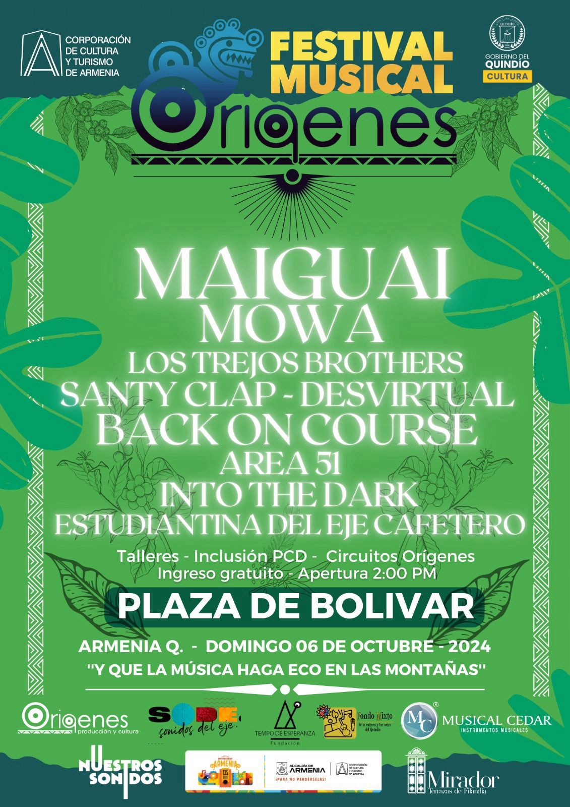 El tradicional Festival Musical Orígenes en su doceava edición, pondrá a vibrar a los amantes de la música de la región con bandas como Maiguai, Mowa, Area 51 o Los Trejos Brothers. Desde el metal hasta la música folclórica se escuchará en el escenario de la Plaza de Bolívar, brindando a los espectadores una experiencia de un ecosistema musical para todos los gustos, para gozárcela, cantar, bailar y compartir con los amigos. El Festival inicia a las dos de la tarde con talleres y la banda Estudiantina del Eje Cafetero, folclor andino colombiano, sonidos de alegría para empezar una...