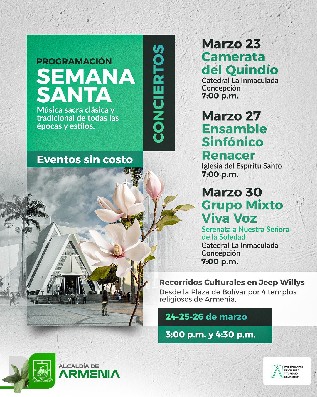 La Alcaldía Municipal de Armenia, a través de la Corporación de Cultura y Turismo de Armenia, celebrará la semana santa 2024 con una serie de eventos gratuitos : Marzo 23 Camerata del Quindío. Catedral La Inmaculada Concepcion 7:00 p.m. Marzo 27 Ensamble Sinfónico Renacer Iglesia del Espíritu Santo 7:00 pm Marzo 30 Grupo Mixto Viva Voz Serenata a nuestra Señora de la Soledad Catedral La Inmaculada Concepción 7: 00 pm   Importante : Para el recorrido en Jeep Willys por los principales templos de la ciudad, realizar pre-inscripción. Para mas información...