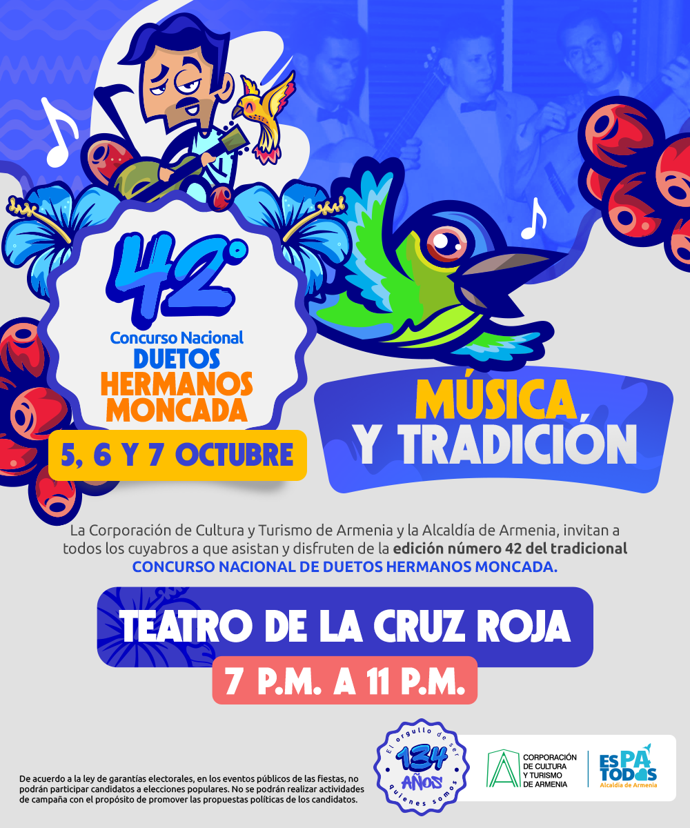 El auditorio de la Cruz Roja será el escenario en el cual se reunirán los mejores duetos de todo el país durante tres días con un mismo objetivo: El Gran Moncada.El Concurso Nacional de Duetos Hermanos Moncada premia y motiva la difusión de nuestros ritmos colombianos, fortalece el crecimiento del pentagrama musical en nuestro país, brinda un espacio a los participantes que desean mostrar su talento artístico dándose a conocer a nivel nacional; no por nada es uno de los concursos musicales más importantes de Colombia, sin olvidar que es un evento que con su nombre rinde homenaje a Evelio,...