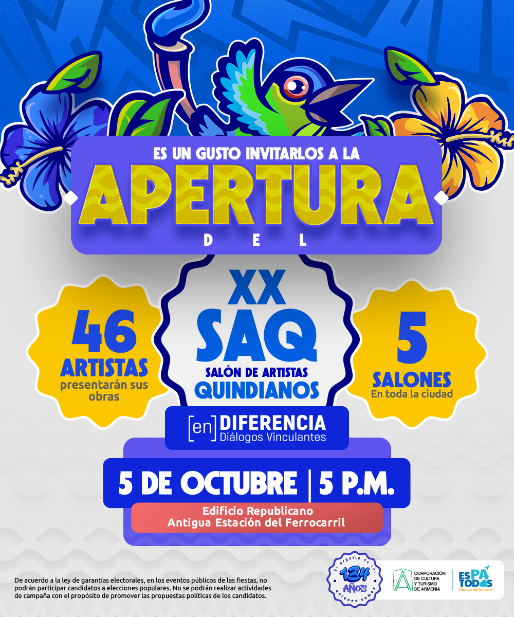 Este jueves 5 de octubre a las 5:00 p.m. será la gran apertura de la versión XX del Salón de Artistas Quindiano, un espacio que reúne los mejores exponentes en las artes plásticas de nuestra ciudad.Este año contaremos con cinco salas de exhibición en simultánea en diferentes partes de la ciudad para la admiración y el disfrute de todos los cuyabros que podrán visitarlas de manera gratuita: -Antigua Estación del Ferrocarril-Instituto Bellas Artes-Sala Biblioteca Comfenalco-Túnel del Ferrocarril-Sala Amable del Hospital San Juan de Dios de Armenia46 artistas presentarán sus obras durante...