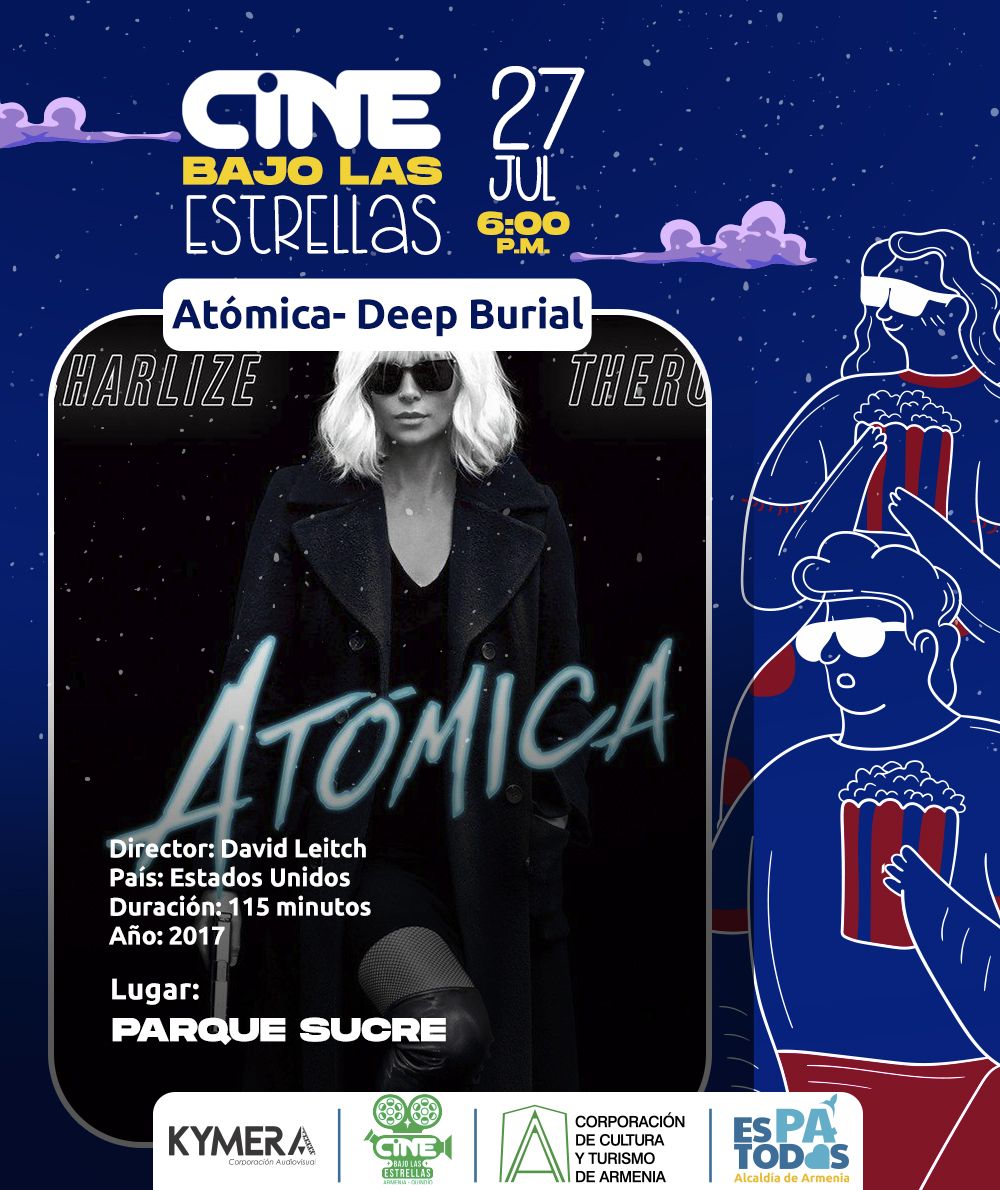 Este jueves 27 de julio Corpocultura a través de la Corporación Kymera, cierra el ciclo “Divercine” con la cinta estadounidense “Atómica” del director David Leitch, una cinta de acción y ciencia ficción protagonizada por la famosa actriz Charlize Theron quien interpreta a la agente Lorraine Broughton.Esta producción nos remite al año 1989 previo a la caída del muro de Berlín, donde la acción y los efectos especiales harán del Parque Sucre el escenario perfecto para disfrutar de esta película en familia.Los esperamos a partir de las 6:00 p.m. Sinopsis: 1989, el muro de Berlín está a punto...