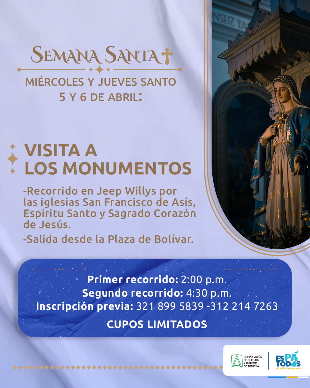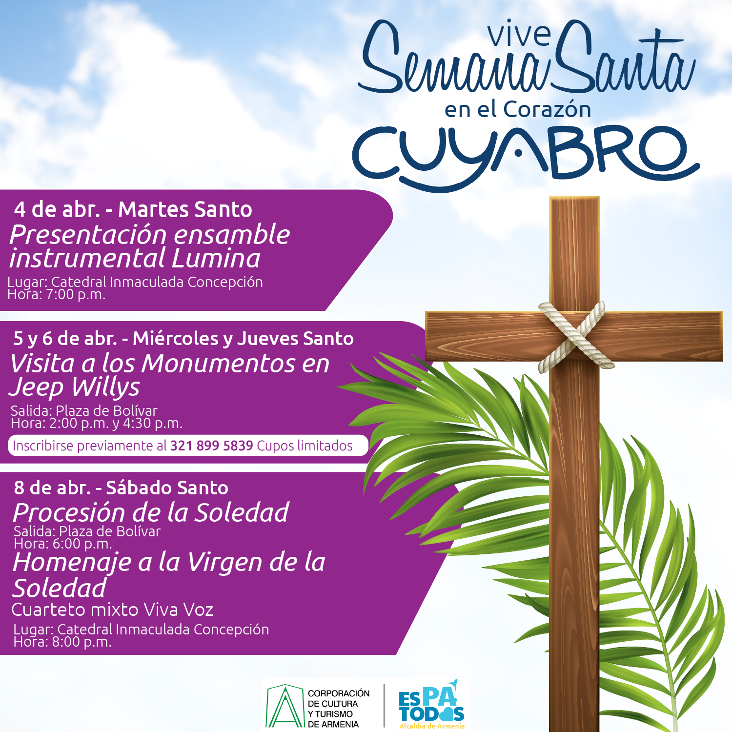 La alcaldía de Armenia a través de la Corporación de Cultura y Turismo celebrará la Semana Santa 2023 con una serie de eventos gratuitos para conmemorar la pasión, muerte y resurrección del Señor en esta festividad que realiza la iglesia católica desde hace más de II siglos alrededor de todo el mundo. Martes Santo – 4 de abrilPresentación ensamble musical instrumental LuminaLugar: Plaza de BolívarHora: 7:00 p.m. Miércoles y Jueves Santo – 5 y 6 de abrilVisita a los Monumentos en Jeep WillysSalida: Plaza de BolívarHora: 2:00 p.m. y 4:30 p.m. Sábado SantoProcesión de...