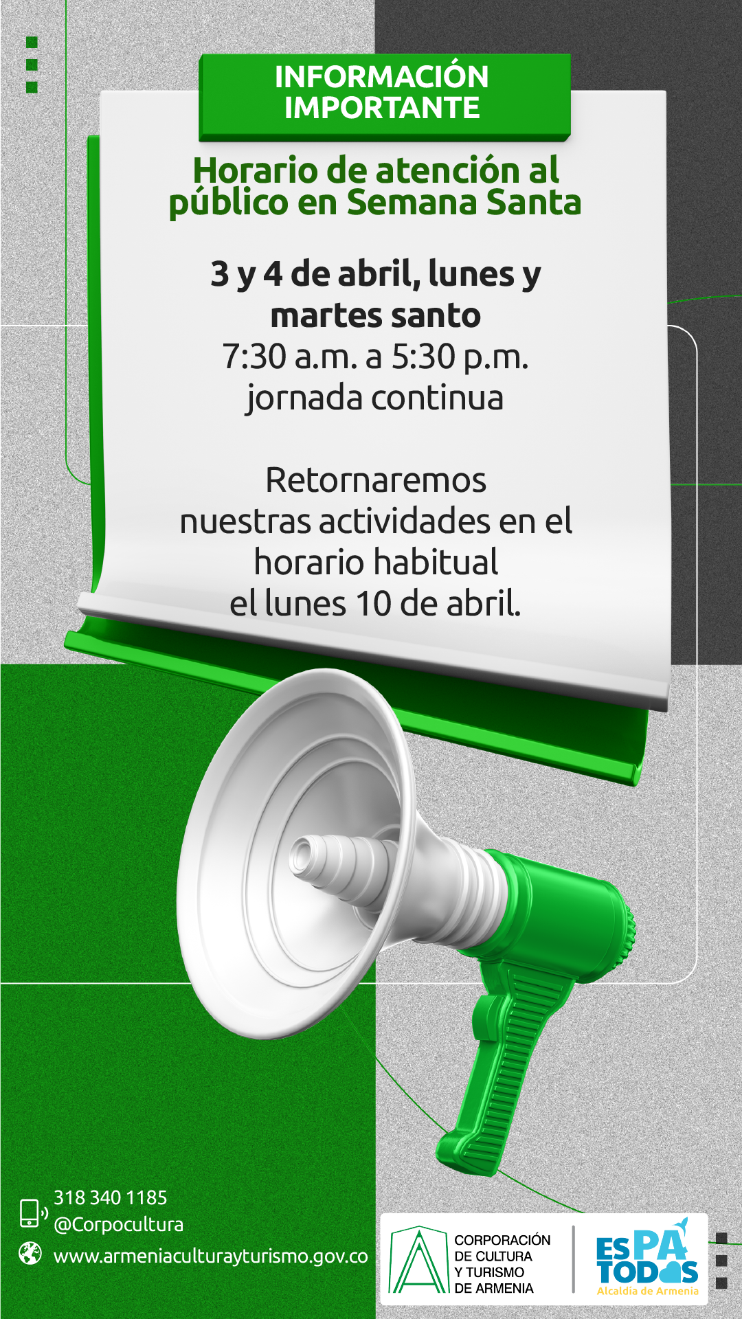 La Corporación de Cultura y Turismo de Armenia a través de la resolución 015 del 31 de marzo de 2023 “por medio del cual establece el horario de trabajo y horario laboral flexible en la Corporación de Cultura y Turismo de Armenia, Quindío desde el lunes 3 de abril de 2023 en adelante y hasta nueva directriz”, lo anterior considerando la celebración de la Semana Santa Católica en el país y velando porque los colaboradores de la institución puedan hacer lo debido en familia sin afectar la prestación de servicios al público externo y respetando la jornada laboral de 44 horas semanales.Así...