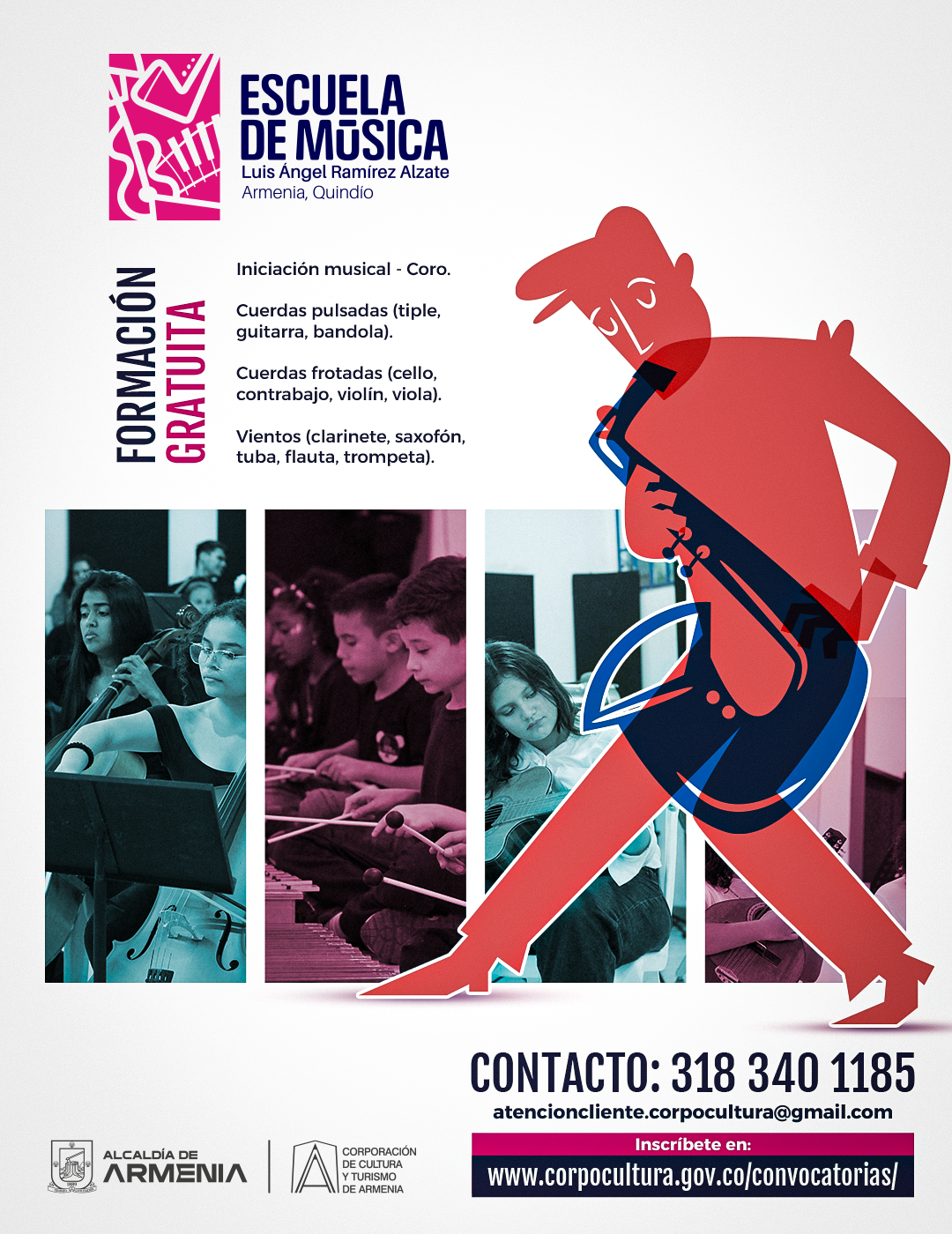 La Escuela de Música Luis Ángel Ramírez Álzate de Armenia inició su ciclo de clases beneficiando a más de 650 niños, niñas y jóvenes de nuestra ciudad. Este programa es gratuito y está dirigido a personas entre 7 y 23 años. Las clases se desarrollarán en jornada contraria a la escolar, en diversas instituciones educativas públicas de Armenia, tales como Inem (sede principal), Casd, Normal Superior, Ciudadela del Sur, El Caimo, Teresita Montes y Laura Vicuña. La escuela ofrece cinco líneas de formación musical: Iniciación musical para niños de 7 a 9 años. Cuerdas frotadas (violín,...